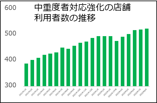取り組んでいったことの一つとして「介護度別専門店化」というのがあります。地域のお客様の特性によって、また店舗のスタッフの強みも考慮して、軽度の利用者様への対応を強化する店舗、中重度の利用者様への対応を強化する店舗、それぞれメリハリをつけていきました。