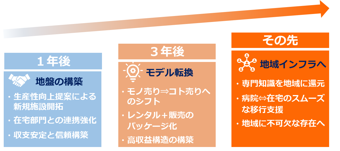 価値提供の「コト売り」へ単なるモノの提供にとどまらず、施設の生産性向上を支援する研修や、専門的な知見を提供する「研究所」のような機能を充実させます。病院から在宅へのスムーズな移行を支える啓蒙活動を通じて、地域になくてはならない存在へと進化させていきます。